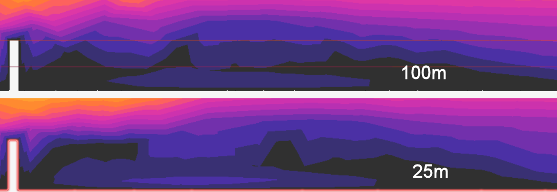 25m henge, shows that the wind speed increases slower for a 100m